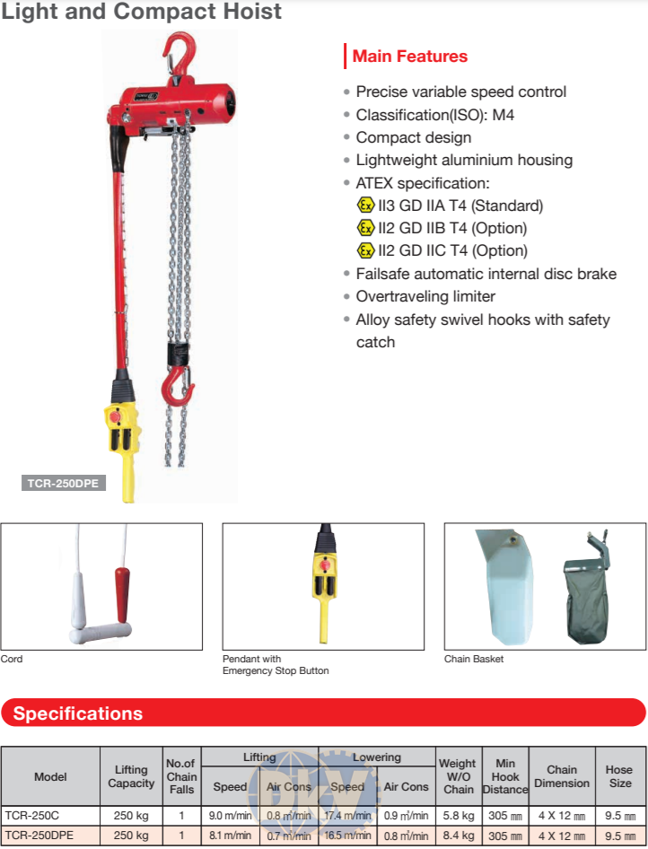 - Trang bị 1 đường dây xích tải. Sử dụng nguồn khí nén, tốc độ nâng được hiển thị là tốc độ nâng tối đa khi nâng tải trọng tối đa. Pa lăng xích tay Toku TCR-250C được tích hợp bộ điều chỉnh tốc độ để dễ dàng thay đổi tốc độ nâng.