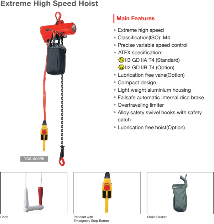 - Trang bị 1 đường dây xích tải. Sử dụng nguồn khí nén, tốc độ nâng được hiển thị là tốc độ nâng tối đa khi nâng tải trọng tối đa. Pa lăng xích tay Toku TCS-500PE được tích hợp bộ điều chỉnh tốc độ để dễ dàng thay đổi tốc độ nâng.