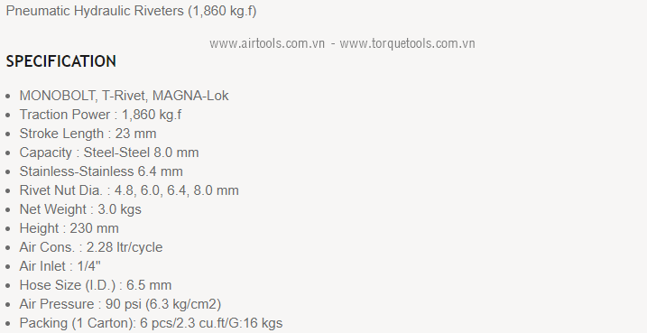 - Súng bắn đinh rút khí nén Gison GP-101TM, Gison air hydraulic riveter GP-101TM chuyên dùng để bắn đinh rút các size: 4.8, 6.0, 6.4, 8.0 mm trong công nghiệp.
