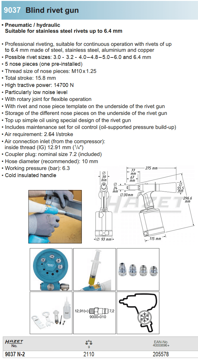- Súng bắn đinh rút khí nén Hazet 9037N-2 hoạt động với áp khí nén < 6.3 bar, với đầu coupler 1/4", ống dây khí nén 3/8" (10 mm). Lưu lượng khí nén khi hoạt động: 2.64 l/stroke, lực siết rút cắt max: 14.700 N.m.