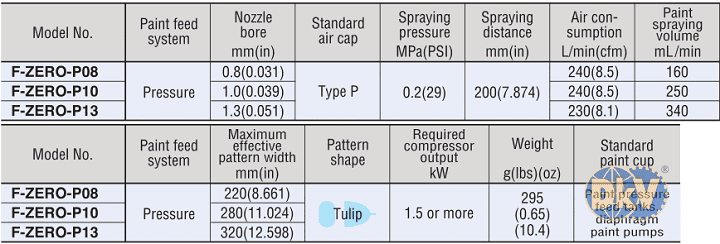 - Súng phun sơn khí nén Meiji F-ZERO-P13 có khối lượng phun sơn: 340 ml/phút, khoảng cách phun: 200 mm.