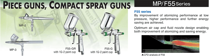 - Súng phun sơn khí nén Meiji MP-3, Meiji air spray gun MP-3: là loại súng phun sơn khí nén có đường kính vòi phun: Ø 0.3 mm chuyên dùng để tạo ra một lớp phủ vừa đảm bảo bề mặt được sơn tránh khỏi những tác động môi trường bên ngoài như thời tiết, ẩm mốc, …vừa đảm bảo tính thẩm mỹ cho vật thể được sơn trong gia đình cũng như trong công nghiệp.