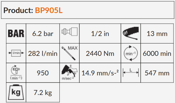 - Súng khí nén Bahco BP905L có tốc độ không tải: 6.000 rpm.Lưu lượng khí: 282 lít/phút.Gia tốc rung: 14.9 m/s².