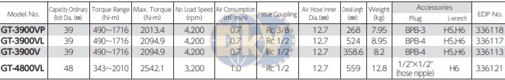 - Súng siết bulong khí nén Vessel GT-3900VP có tốc độ không tải: 4.200 rpm, khả năng vặn bulong: 39 mm, dải lực siết hoạt động: 490 - 1.716 N.m.