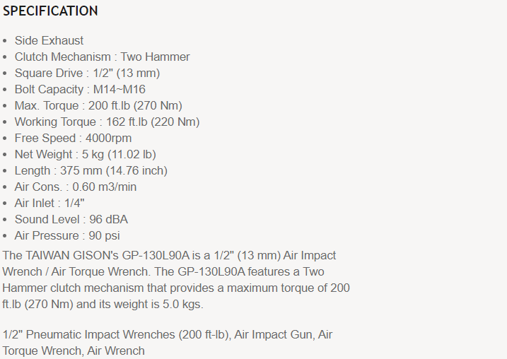 - Súng khí nén Gison GP-130L90A có lực siết làm việc < 200 ft.lb (270 Nm). Lưu lượng khí: 90 psi.
