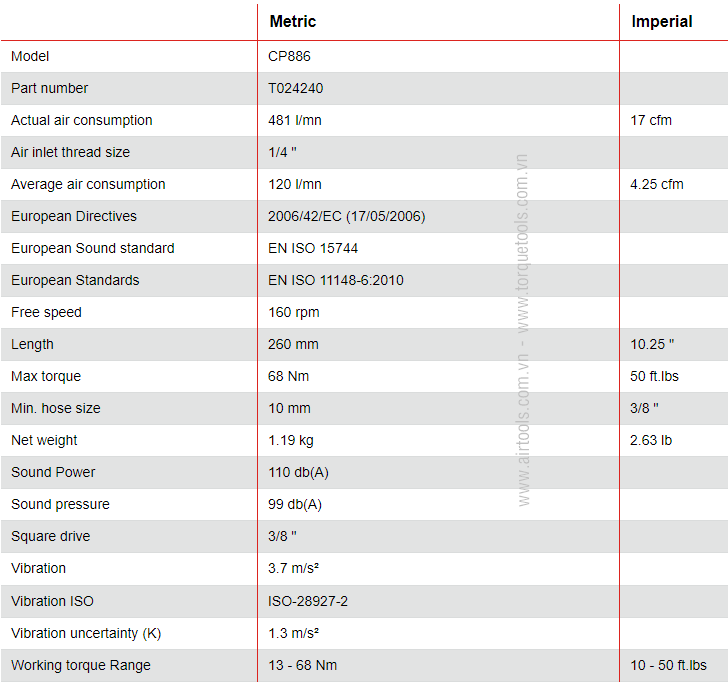 - Súng siết bulong khí nén Chicago Pneumatic CP886 có tốc độ không tải: 160 rpm, lưu lượng khí: 4.25 cfm. Độ ồn khi làm việc: 99 dbA. Đường ống dẫn khí nén có đường kính max: 3/8", đầu kết nối với nguồn khí nén có tiêu chuẩn: 1/4".