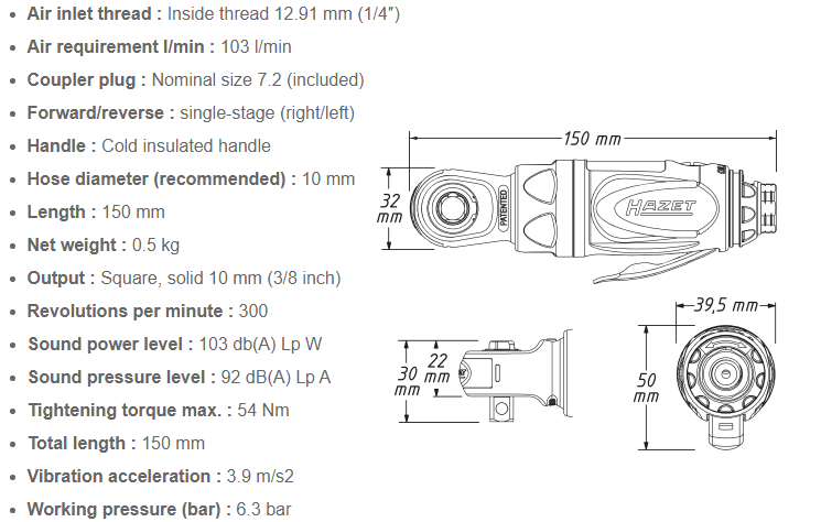 - Súng khí nén Hazet 9021P-2 có chiều dài tổng thể: 150 mm, trọng lượng: 0.5 kg.