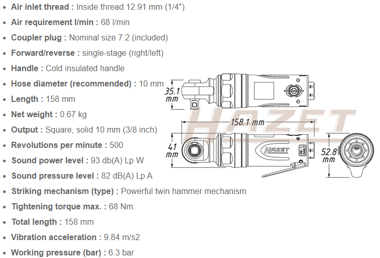 - Súng khí nén Hazet 9021SR-1 có tốc độ không tải: 500 rpm. Lưu lượng khí: 68 lít/phút. Đầu kết nối với nguồn khí nén ren tiêu chuẩn 1/4"-NPT (12.91 mm), độ ồn khi làm việc: 82 dbA.