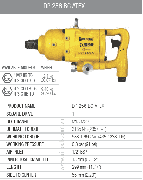 - Súng siết bulong chống cháy nổ Dino Paoli DP 256 BG ATEX có lực siết max: 3.185 N.m (dải lực siết làm việc: 588 - 1.666 N.m), với cỡ khẩu cắm bulong: 1".