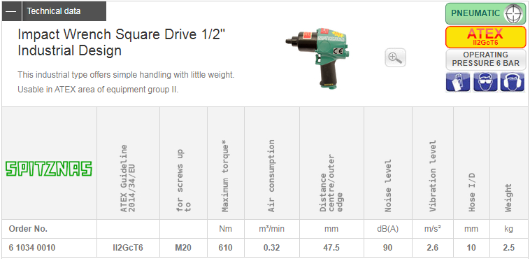 - Súng siết bulong chống cháy nổ Spitznas 6 1034 0010 chế tạo đạt tiêu chuẩn chống cháy nổ ATEX 2014/34/EU (II2GcT6), tuyệt đối an toàn khi vận hành trong môi trường có tính cháy nổ cao.